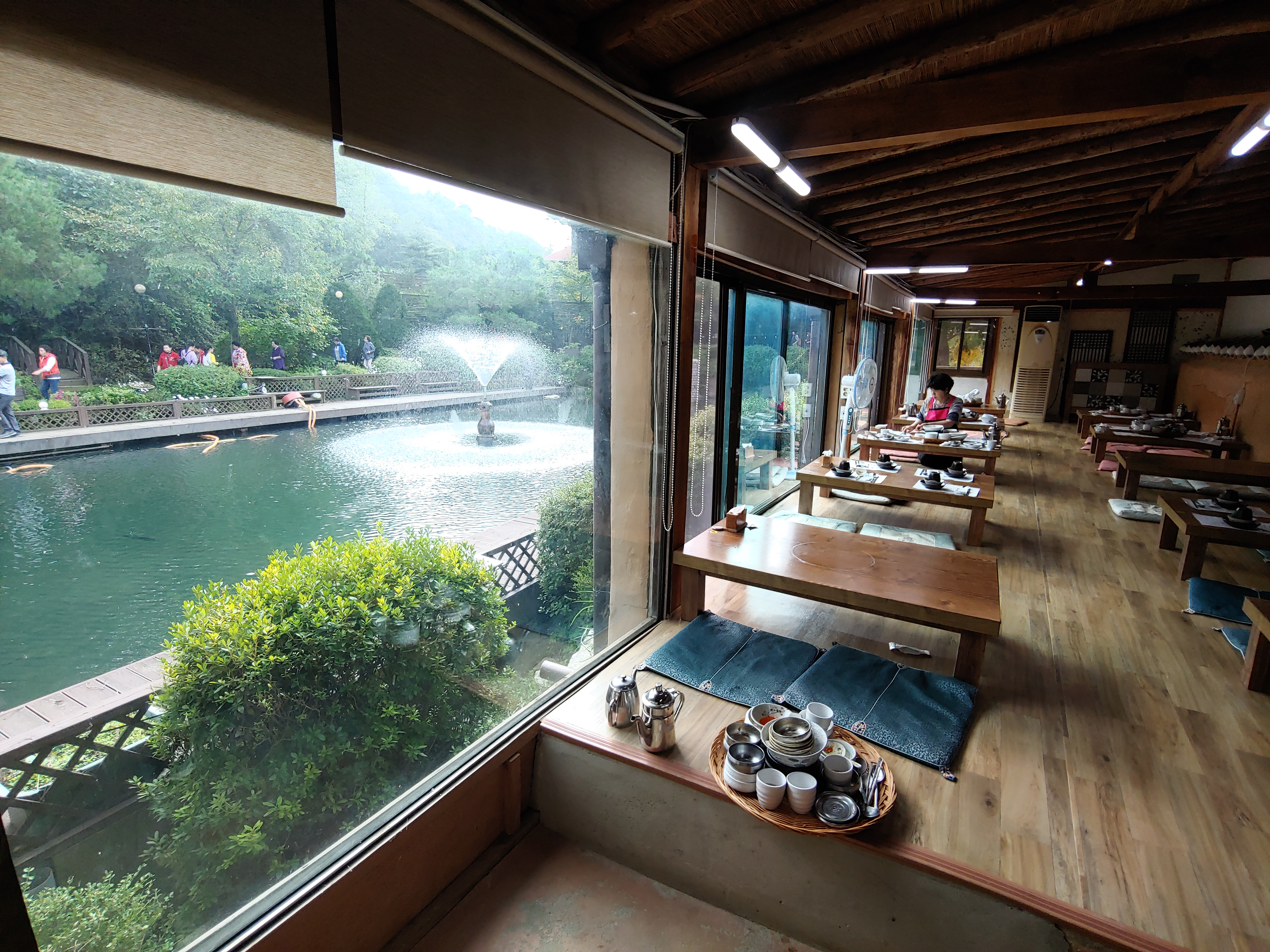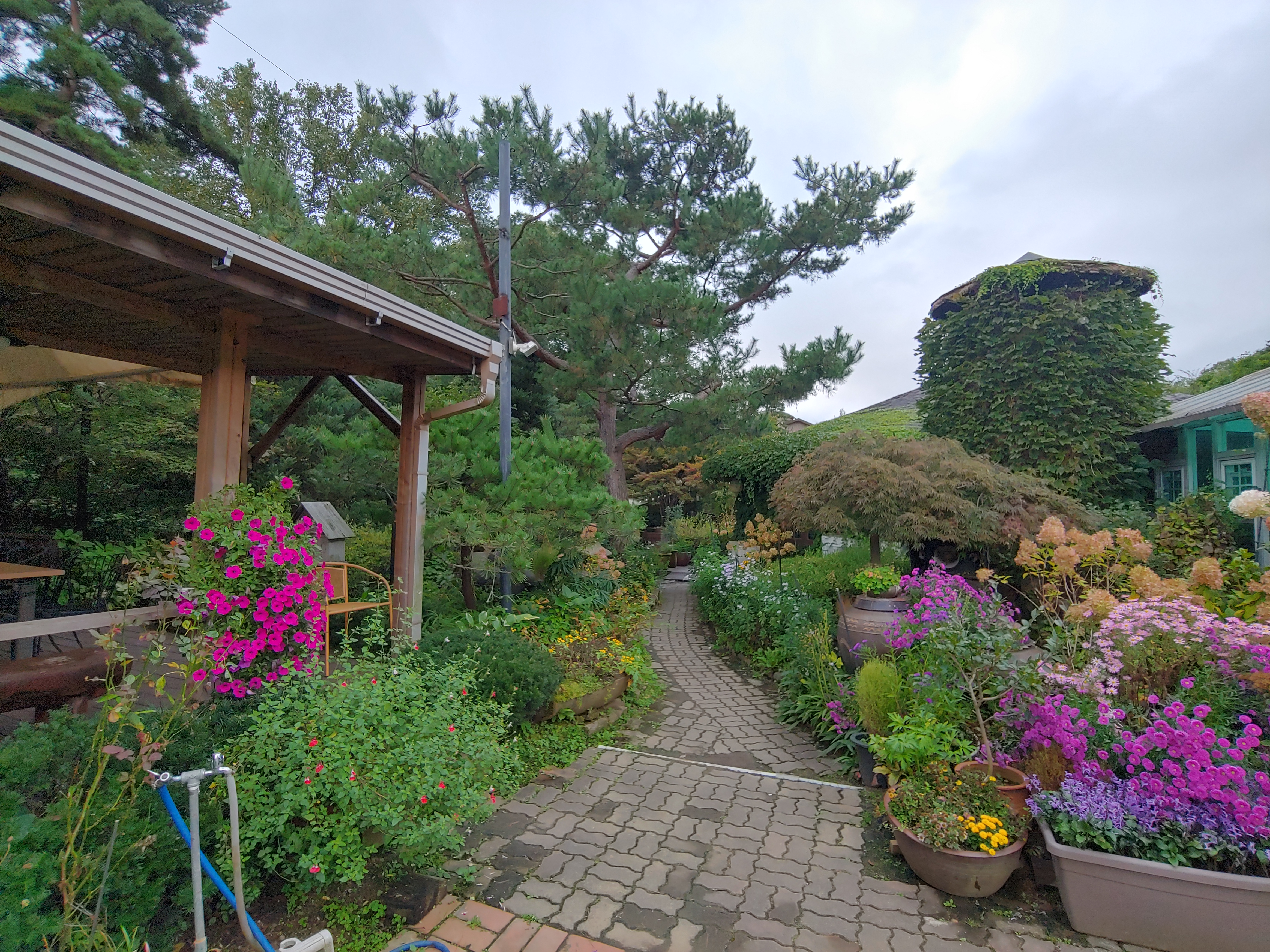식당 앞에서 출입구 쪽을 보고 찍은 사진입니다. 정원이 아름답기 때문에 사진 찍으려는 분들이 참 많습니다.